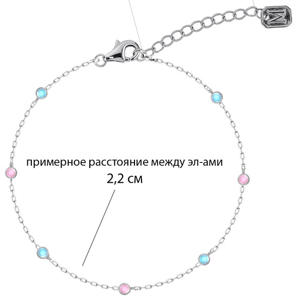 Серебряный браслет на ногу с голубыми и розовыми камнями