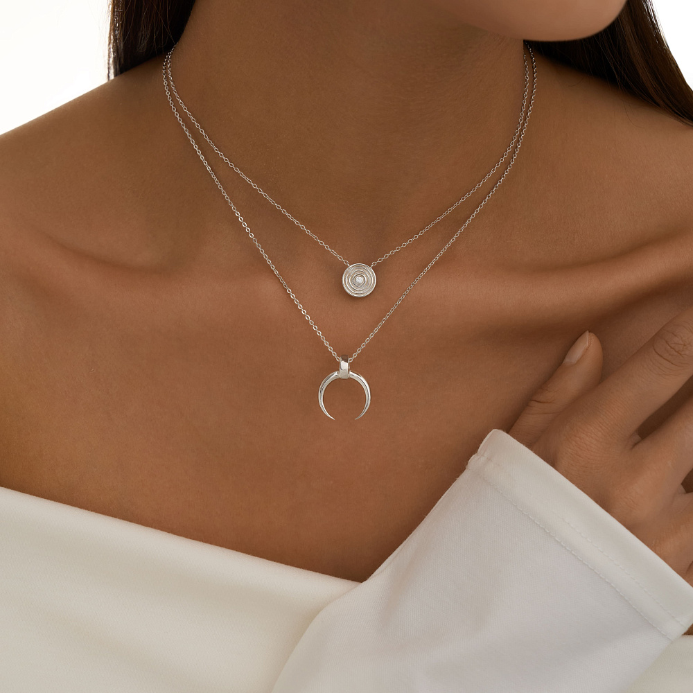 Регулируемая длина от 30 до 38 см позволяет носить украшение как вплотную к шее, так и свободно — на уровне декольте. Родиевое покрытие придает цепочке холодный зеркальный блеск, а монетке — четкий графичный силуэт, подчеркивая глубину огранки центрального камня.